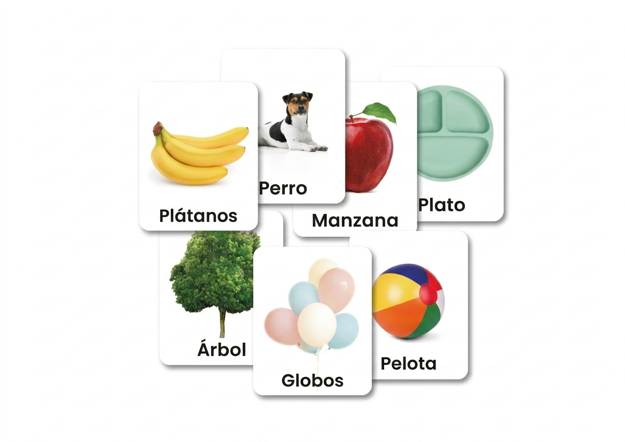 Con imágenes reales de objetos cotidianos, estas tarjetas enriquecen su vocabulario y lenguaje comprensivo. Nombrar los objetos mientras tu bebé los mira crea conexiones neuronales y fomenta la comunicación.